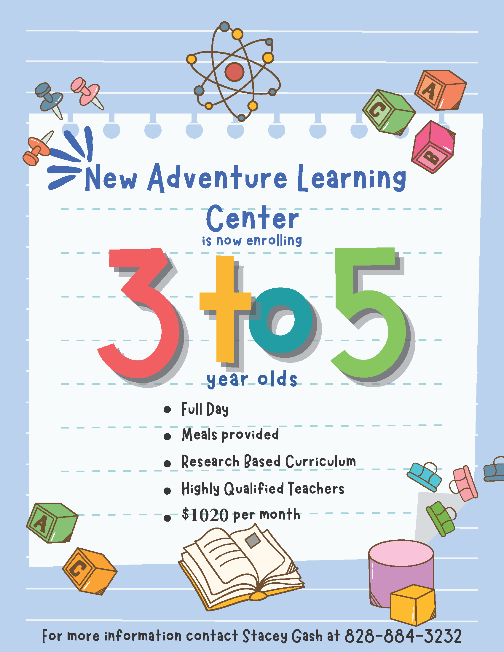 New Adventure Learning Center is open Monday-Friday from 7:30 am until 5:30 pm, year round, except for major holidays as observed by Transylvania County Government offices and 2-4 teacher work days per year.