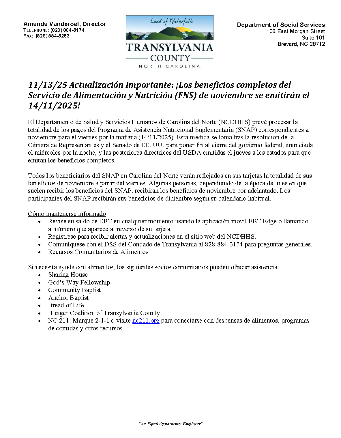 In March 2023, Transylvania County's additional emergency allotments under the Food and Nutrition Services (FNS) program under COVID-19 will come to an end. For households who have been receiving increased FNS payments each month from March 2020 or later, food benefits will be decreased back to standard allotments. Please follow the link below for further information.