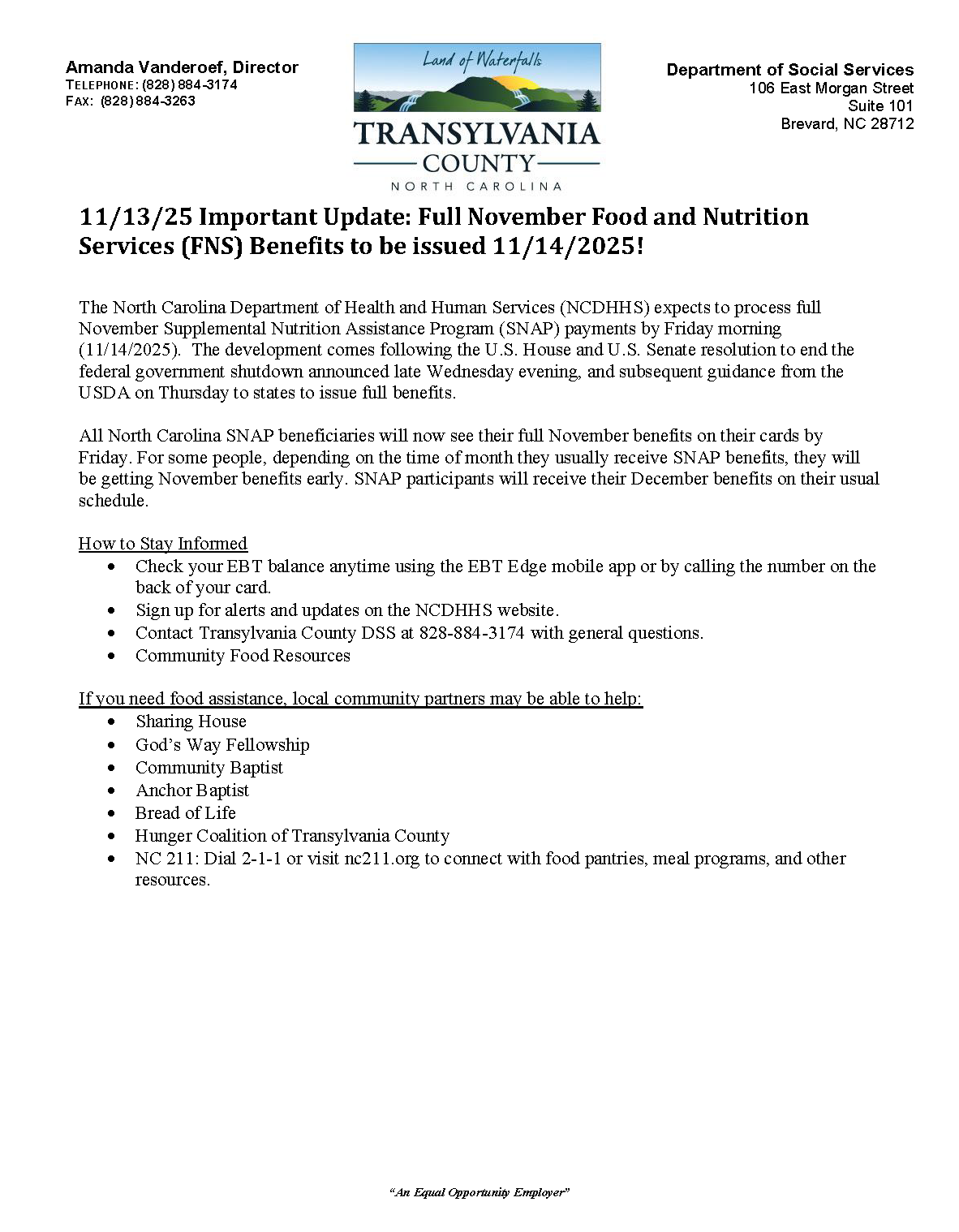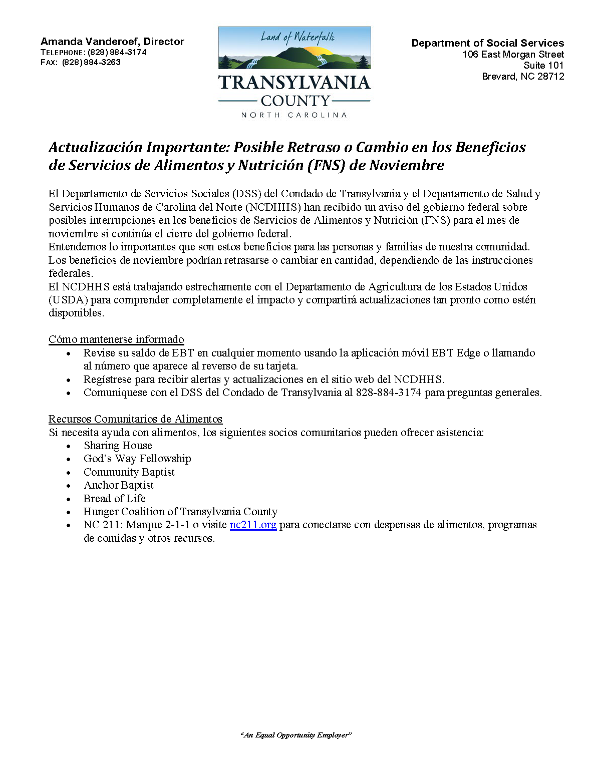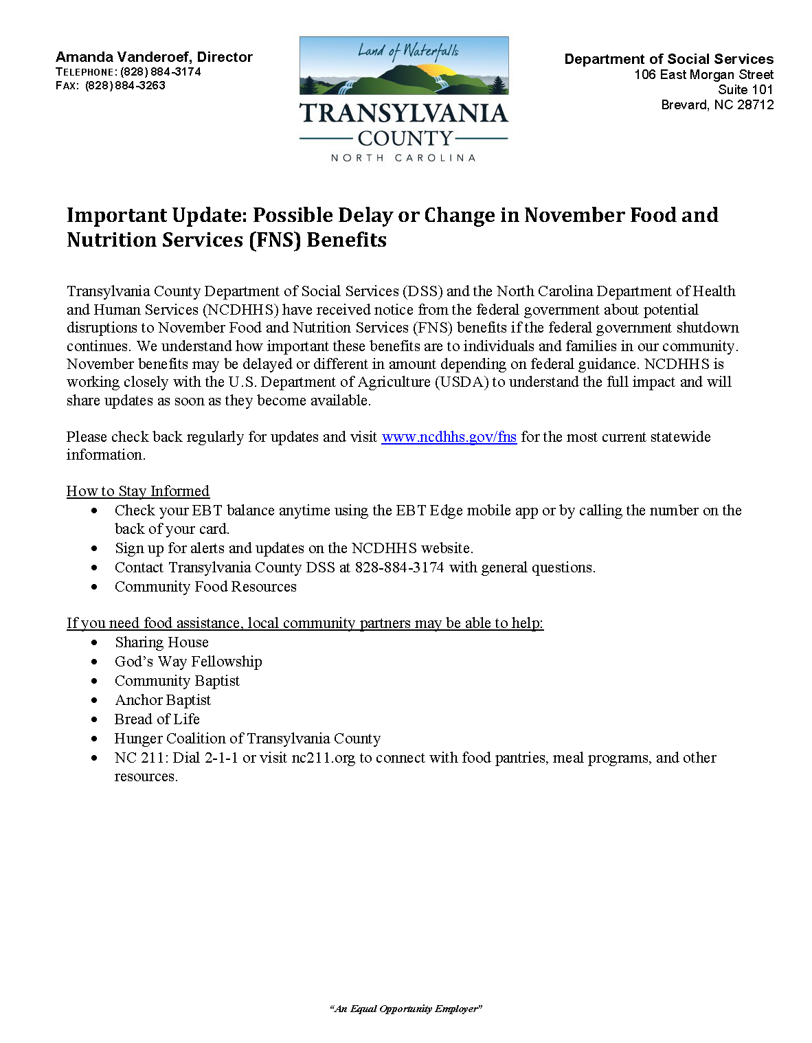 In March 2023, Transylvania County's additional emergency allotments under the Food and Nutrition Services (FNS) program under COVID-19 will come to an end. For households who have been receiving increased FNS payments each month from March 2020 or later, food benefits will be decreased back to standard allotments. Please follow the link below for further information.