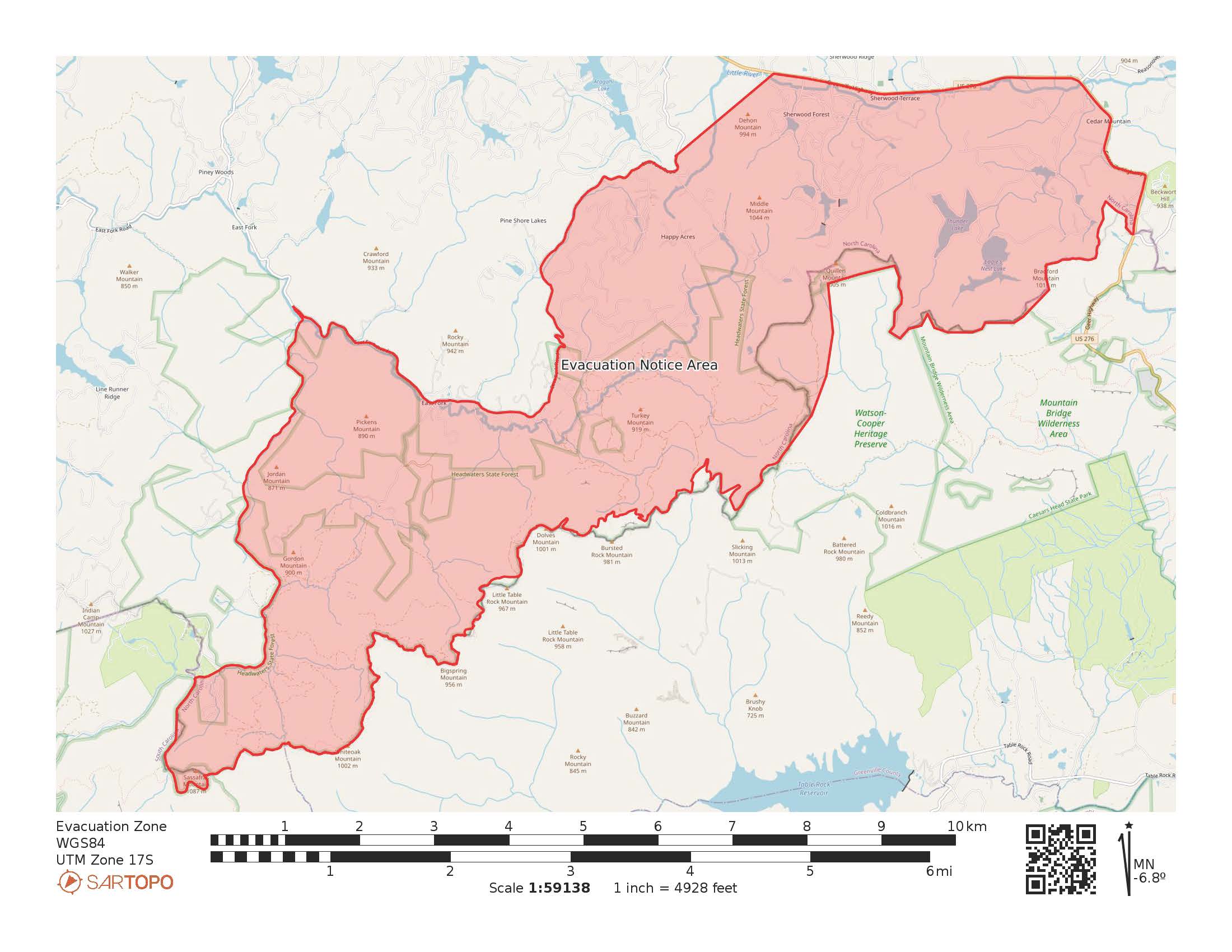 There has been a recent change in the fire. In coordination with NC Forest Service, it has been determined that an immediate mandatory evacuation of the area covering on the south side of East Fork Rd from Glady Fork Rd intersection to the intersection of East Fork Rd and Greenville Hwy and then turning right (south) on Greenville Hwy (Hwy 276S) and covering the area on the west side of Greenville Hwy all the way to South Carolina. A picture showing the area is below for visual reference.